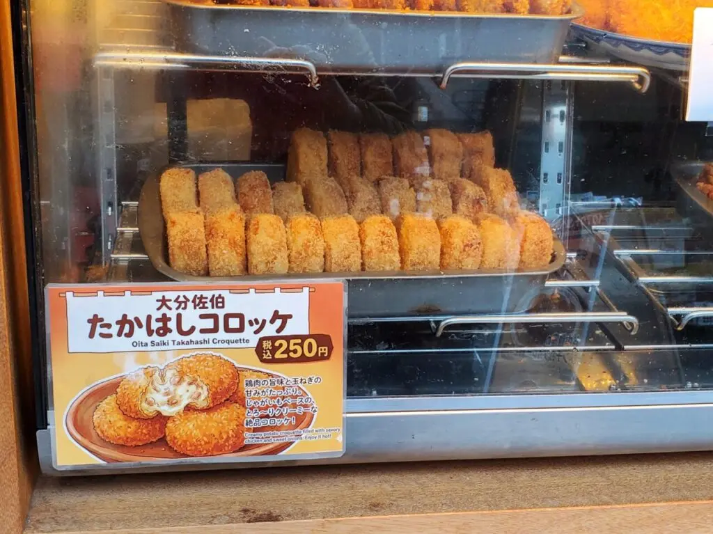 ちょうどコロッケが揚がったばかりのようで、トレーに整然と並べられていました。「大分佐伯 たかはしコロッケ 鶏肉の旨味と玉ねぎの甘みがたっぷり。じゃがいもベースのとろ~りクリーミーな絶品コロッケ」と書かれています。実に美味しそうです。